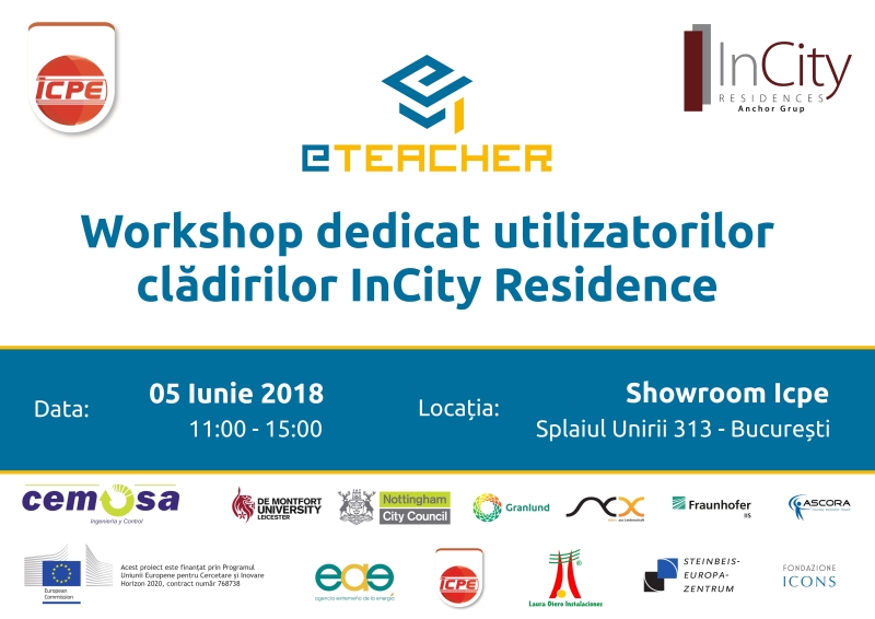 In data de 5 iunie 2018, între orele 11:00 – 15:00, la Showroom-ul Icpe (Splaiul Unirii 313, Bucuresti), va avea loc primul workshop realizat în cadul proiectului european eTEACHER dedicat utilizatorilor clădirilor InCity Residence.